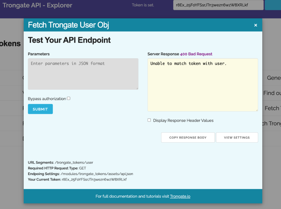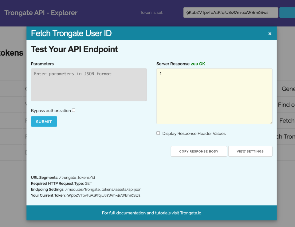 If the token is valid and a Trongate User ID is found, then a 200 HTTP response code will be produced and the HTTP response body with be a numeric value that matches the Trongate User ID for the end user.